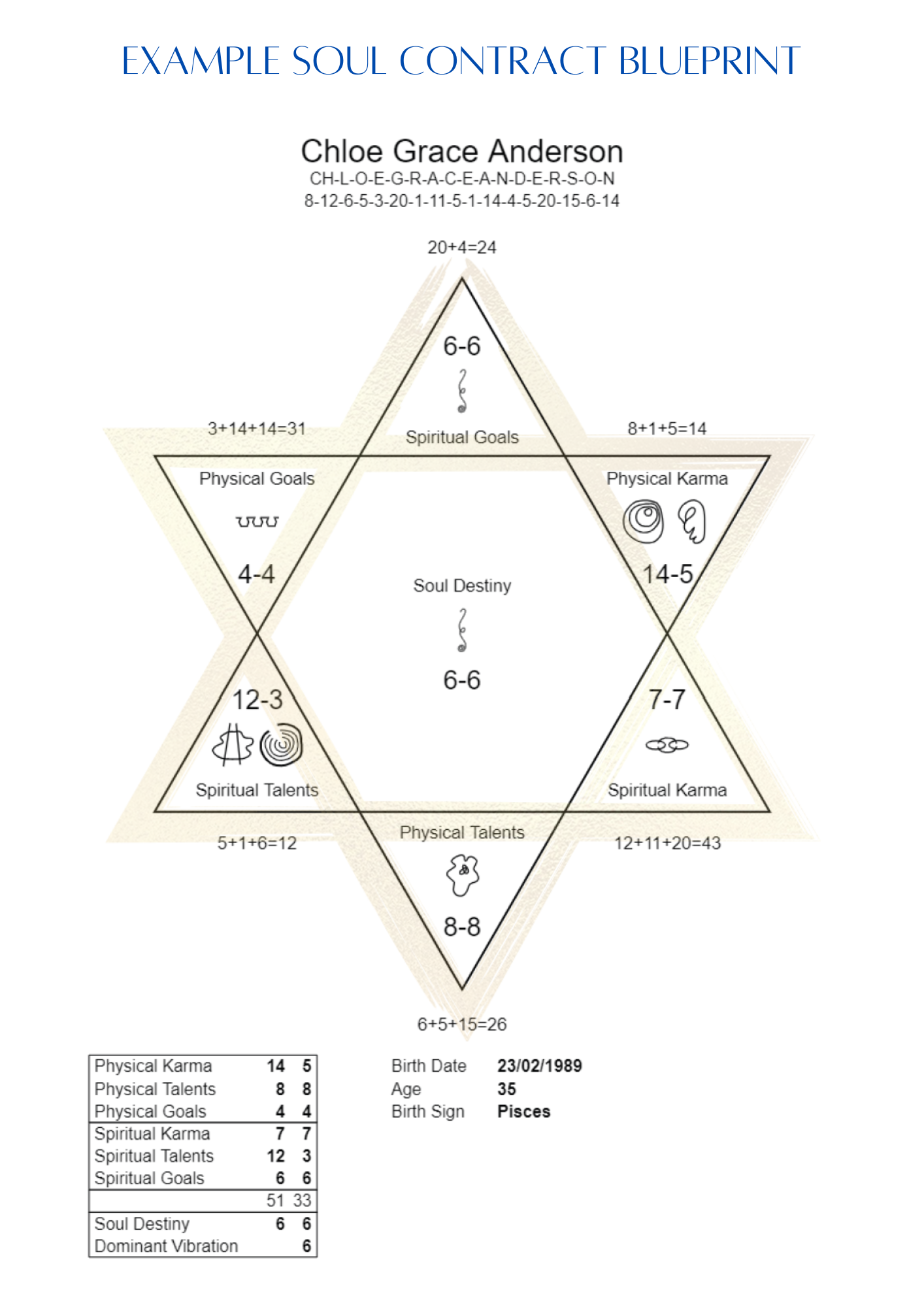 Because your name holds fewer than 10 Hebrew phonetic sounds, this version will show just three values — Karma, Talents, and Goals — rather than the 6 points in a Star of David. This isn’t better or worse, simply how your soul chose to express itself in this lifetime, offering a more concentrated focus on specific energies.